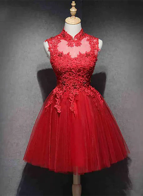 Red Lace High Neckline Tulle Short Homecoming Dress Party Dress Formal Dress with Appliques