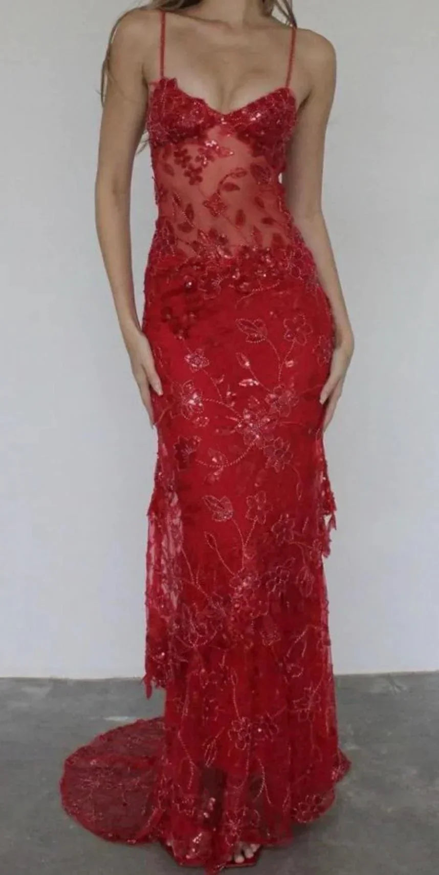 Red Lace Sheath Spaghetti Straps Long Prom Dress
