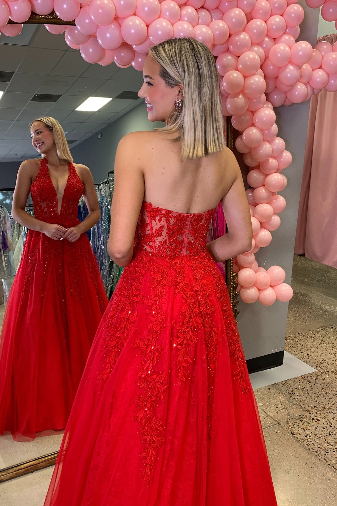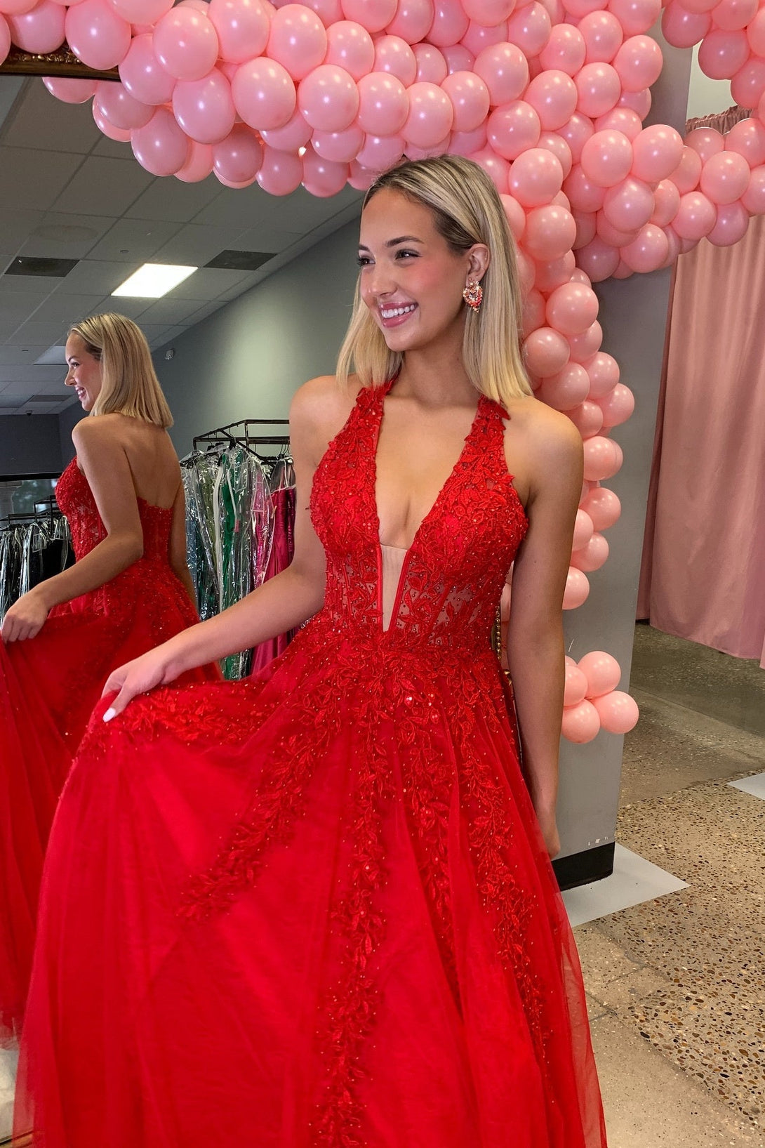 Red Plunging V-neck Beaded Lace Applique Long Dress