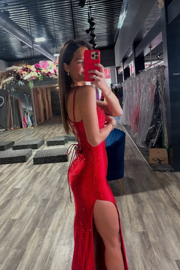 Red Rhinestones Beaded Split Cross Straps Prom Dress ssr0494