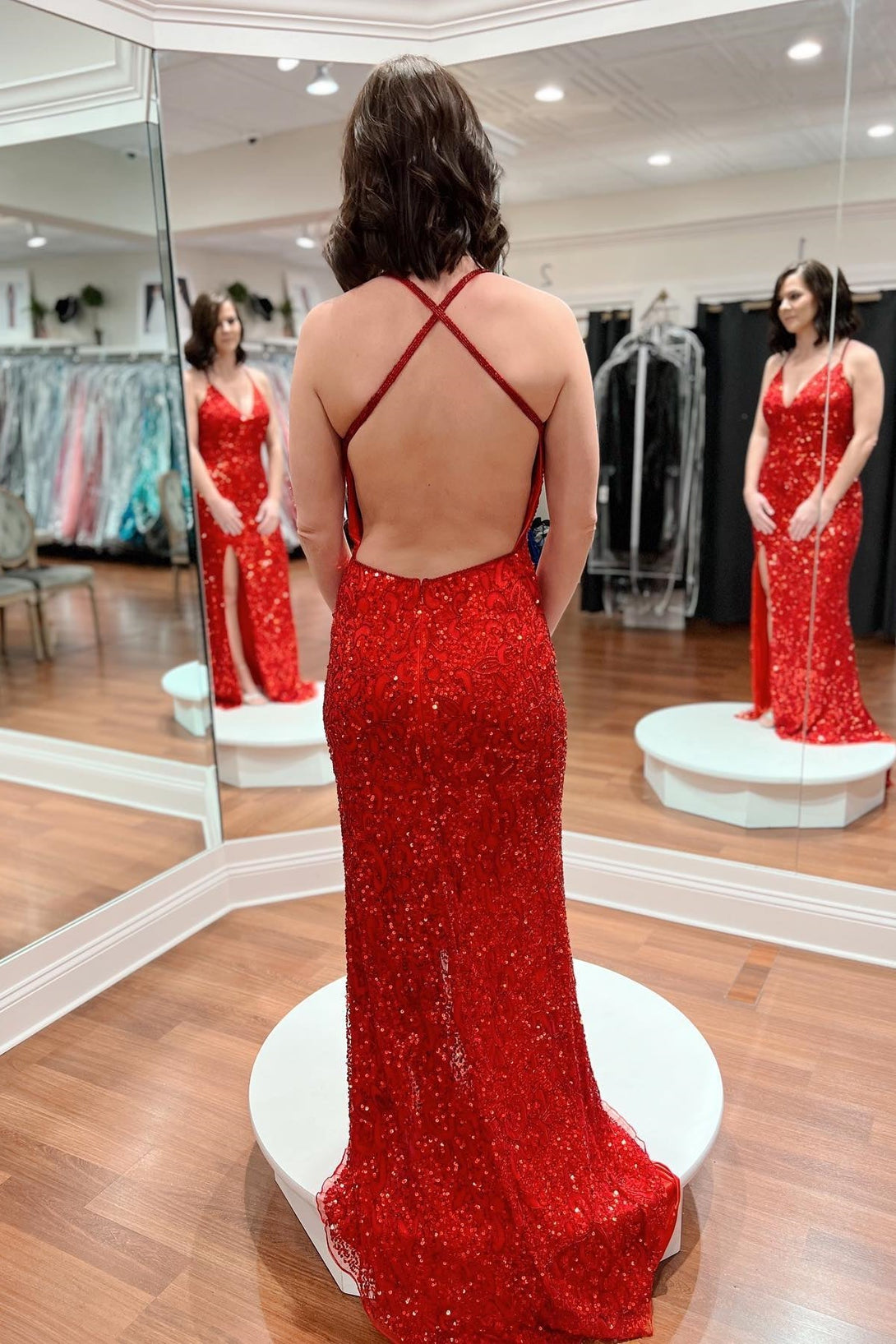 Red Sequin V Neck Mermaid Long Prom Dress with Slit