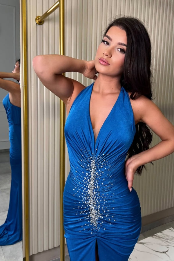 Royal Blue Halter V-Neck Split Beaded Prom Dress ssr0578