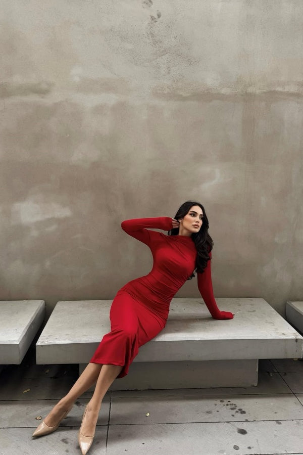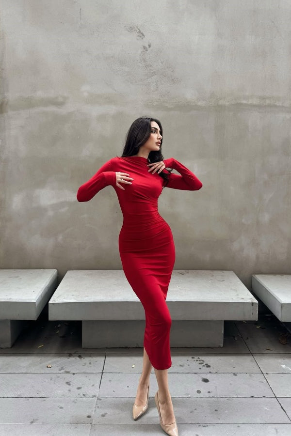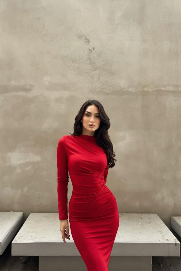 Charming Red High-Neck Long Sleeves Pleated Prom Dress ssr0449
