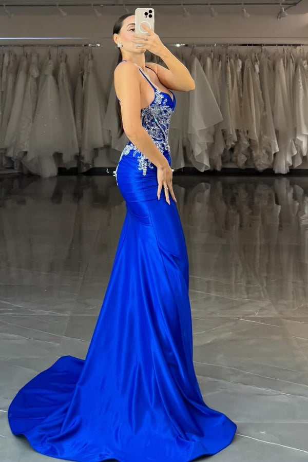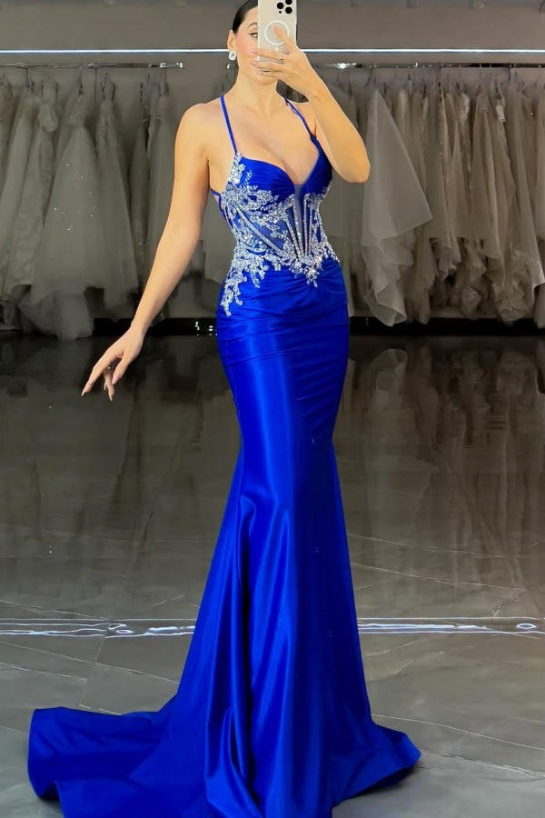 Royal Blue Spaghetti-Straps Mermaid Appliques Stunning Prom Dress ssr0587
