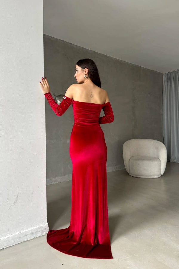 Royal Blue Velvet Strapless Split Long Sleeves Prom Dress ssr0331