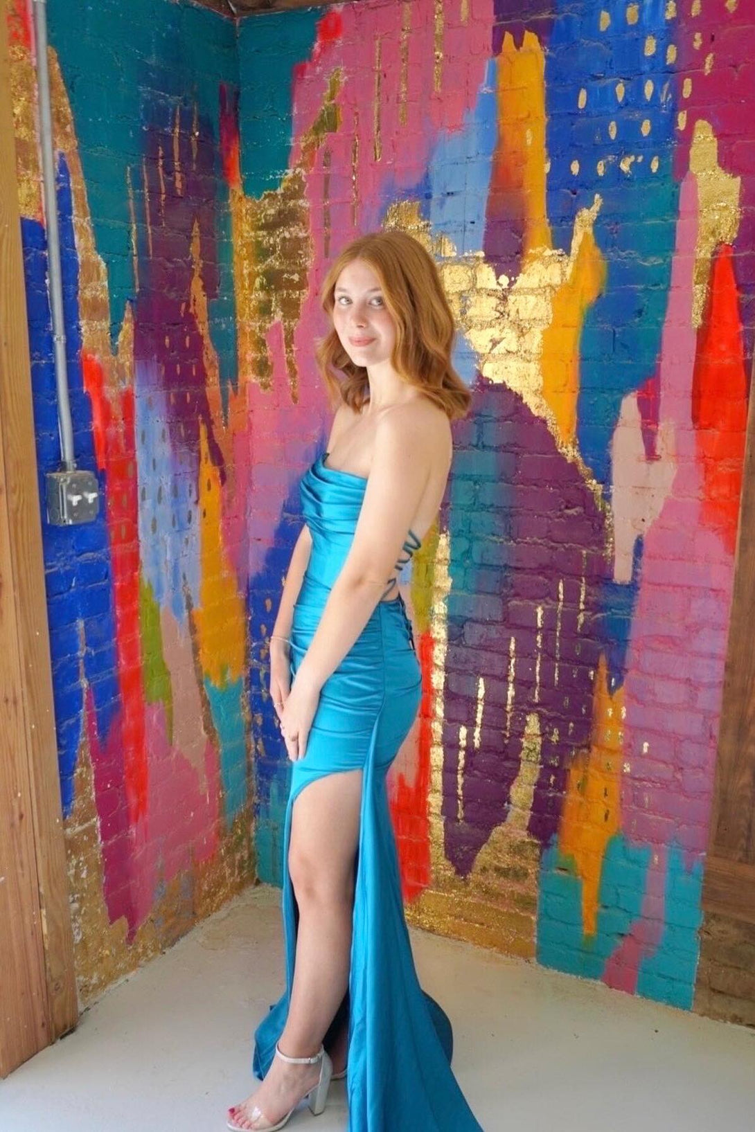 Ruched Teal Blue Satin Mermaid Prom Dress