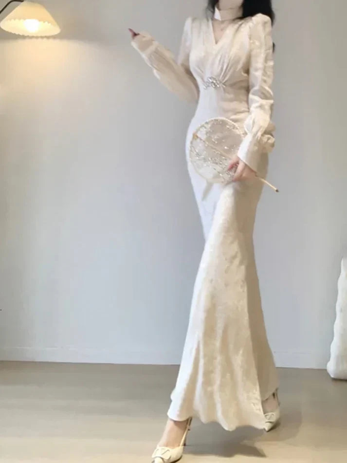 Sexy Mermaid V Neckline Long Sleeves White Prom Dresses Night Dress Birthday Outfits , SSR3586