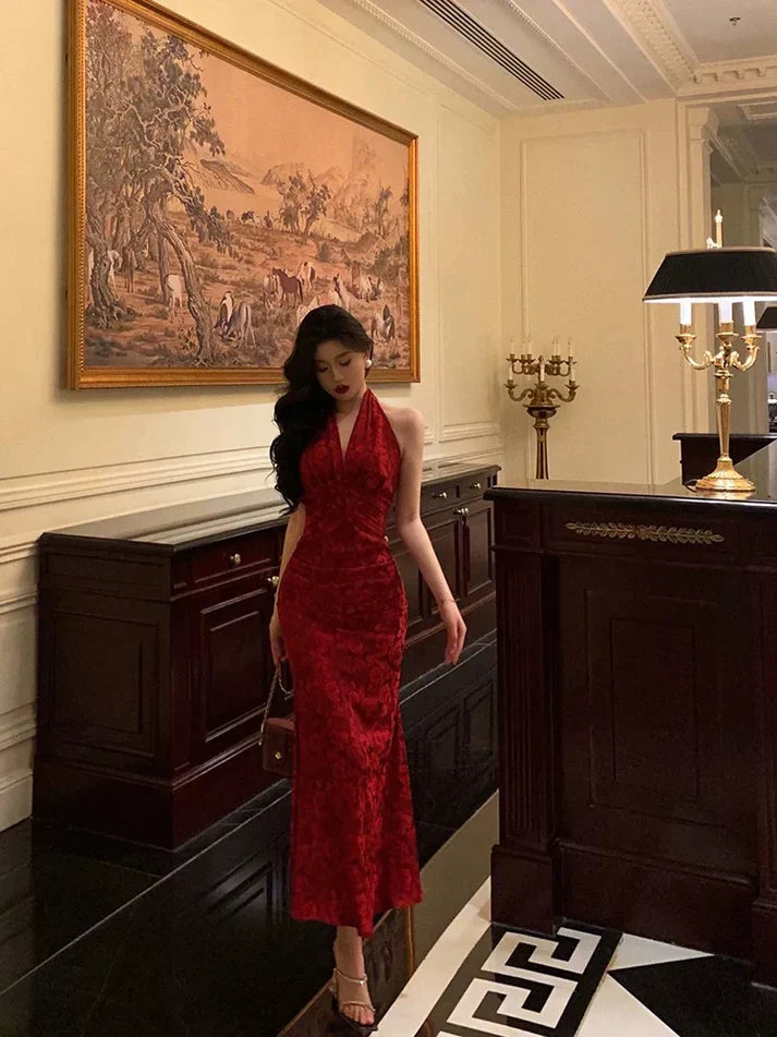 Sexy Sheath V Neckline Red Floral Ankle Length Prom Dresses Birthday Dress , SSR3582