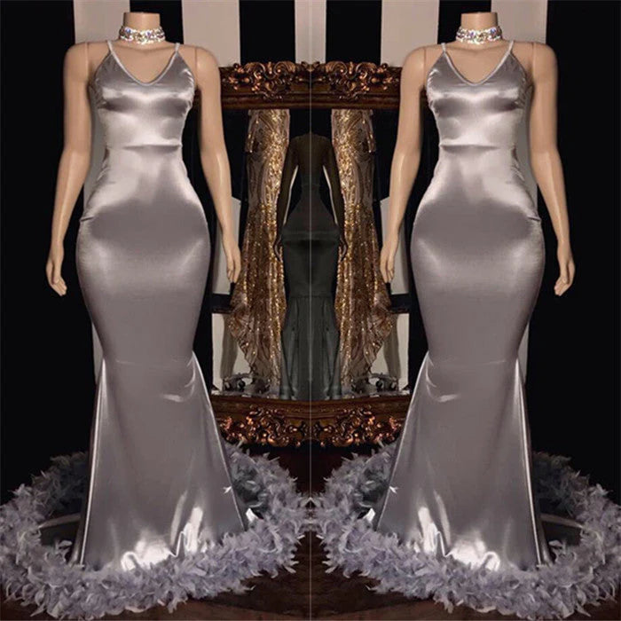 Sexy Spaghetti Straps Mermaid Prom Dresses | Open Back Simple Evening Dress with Fur,SSR1190