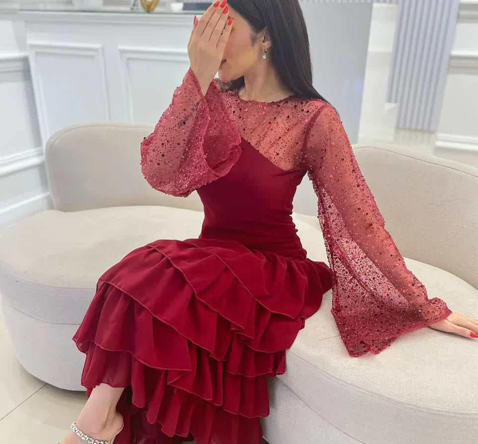 Women's Dress O Neck Tiered Burgundy Long Prom Dress Charming Evening Party Dress