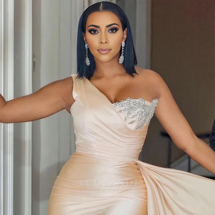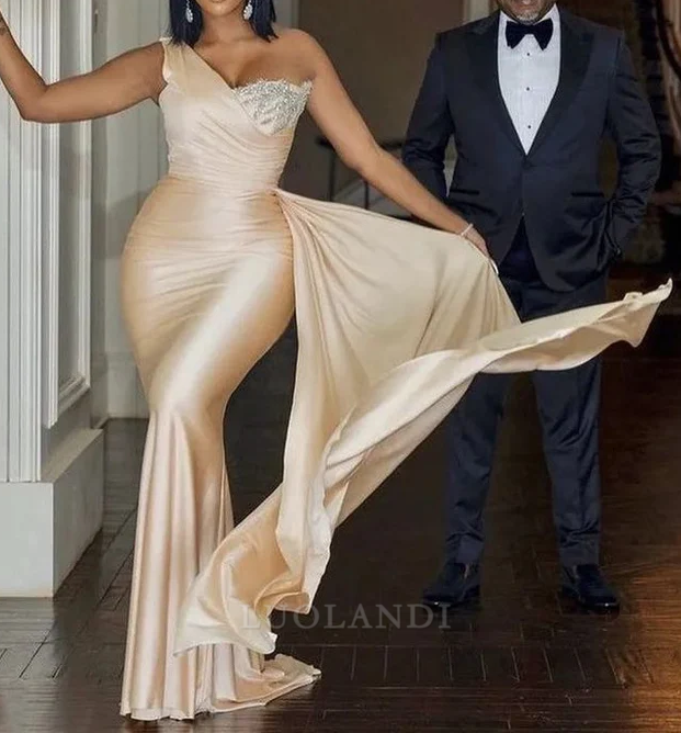 Modest One Shoulder Sleeveless Mermaid Satin Long Prom Dress Charming Evening Party Dress
