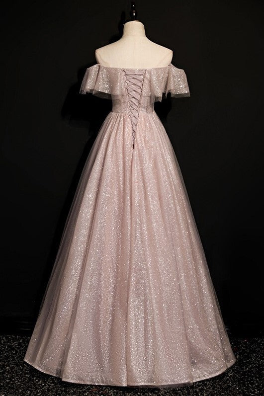 Shimmering Off the Shoulder Rose Gold Long Formal Dress