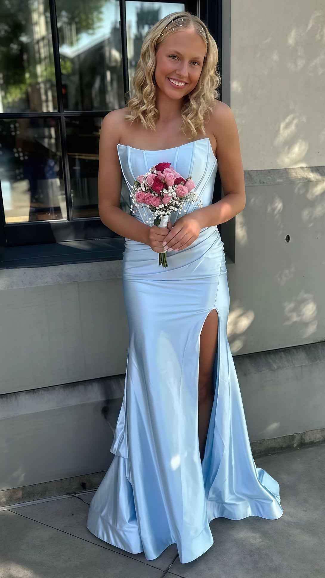 This stunning silver mermaid prom dress is sure to turn heads. With its strapless design and long flowing skirt, you'll feel like a goddess at any party or event. Expertly crafted for a perfect fit, this dress will make you stand out in any crowd.