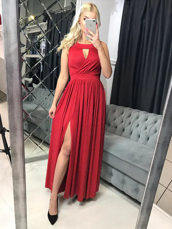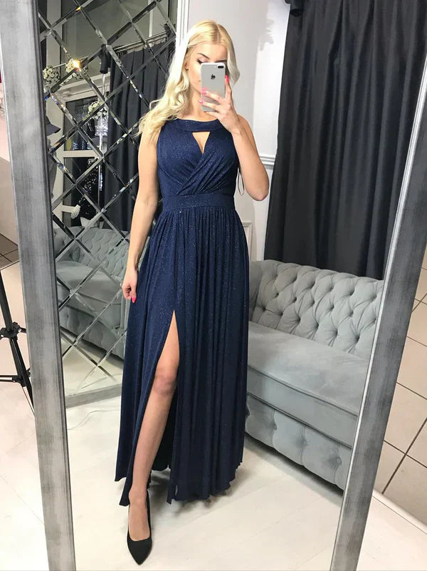 Simple Jewel A-line Prom Dresses Lace Evening Gowns Sparkly Party Dress With Slit