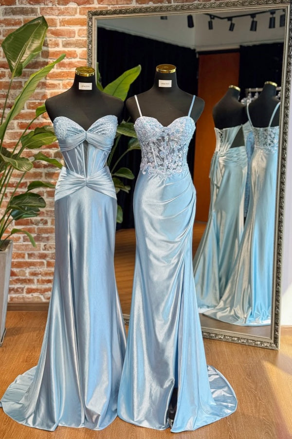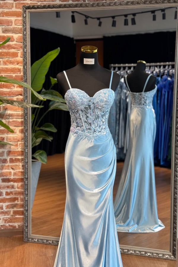 Sky Blue Spaghetti-Straps Split Sweetheart Appliques Prom Dress ssr0621