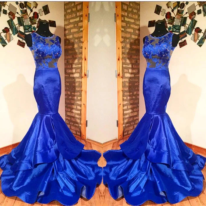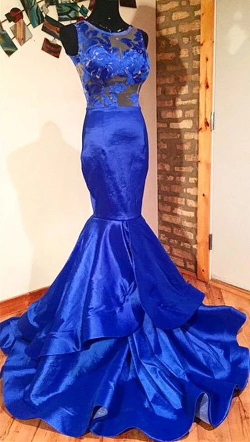 Sleeveless Mermaid Royal Blue Prom Dresses | Lace Appliques Sexy Illusion Evening Gowns,SSR1159