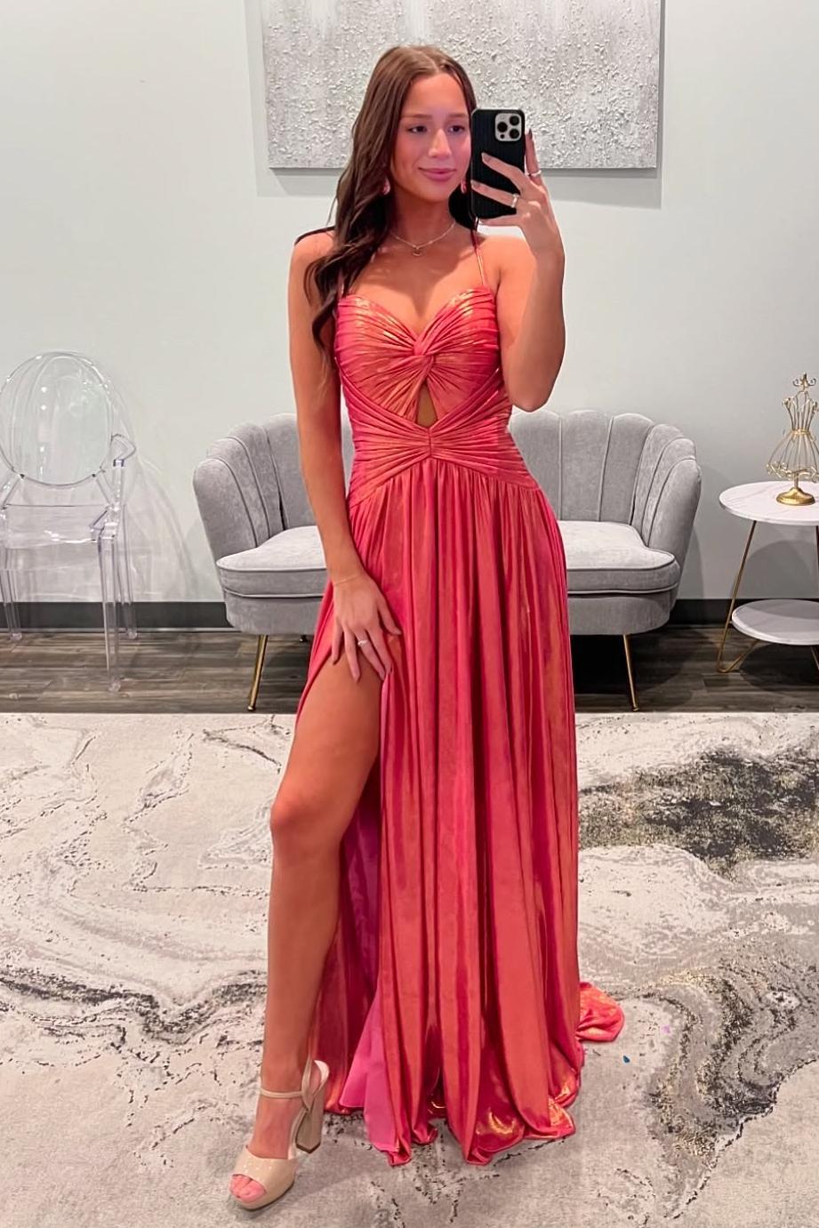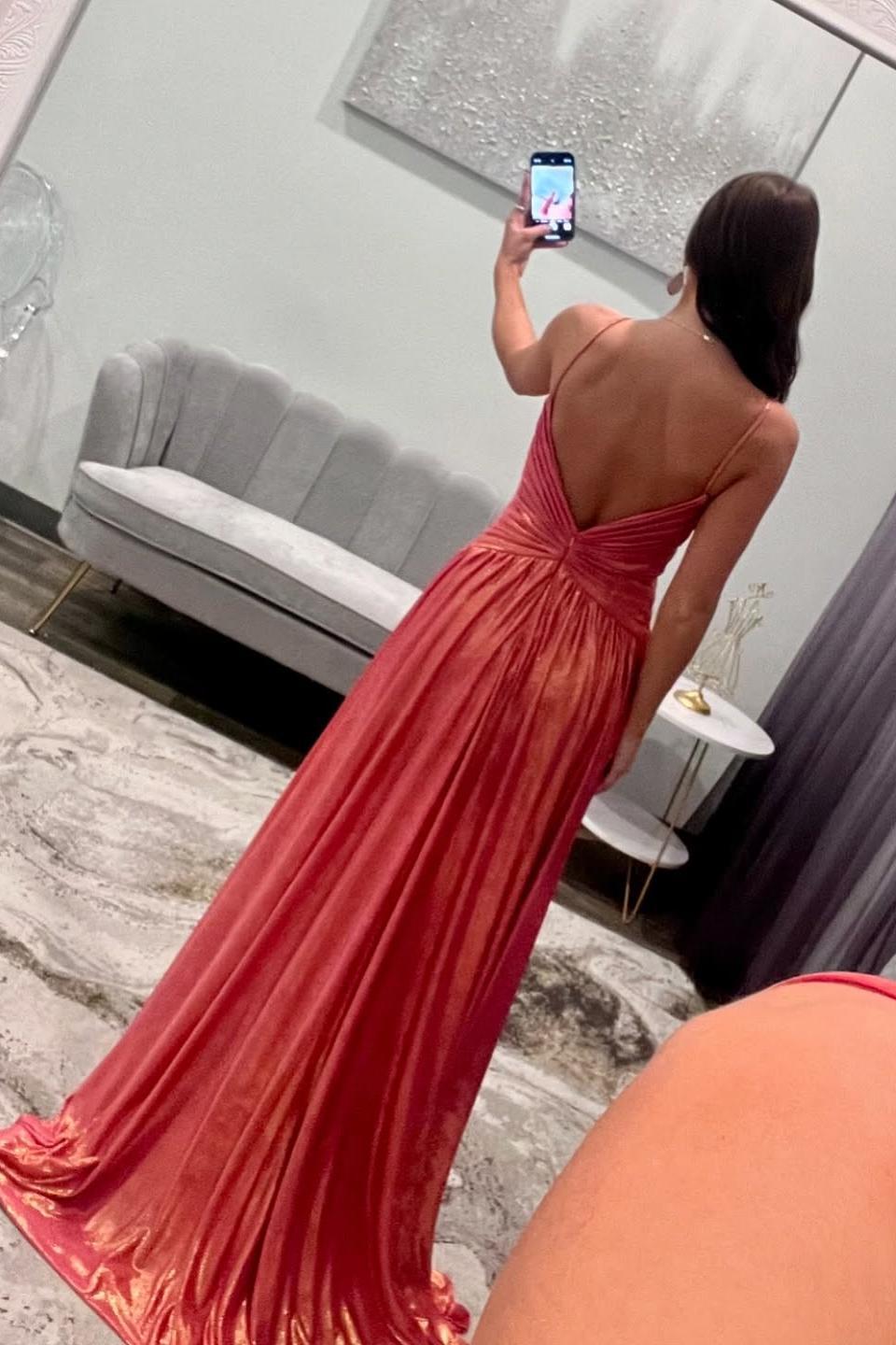 Spaghetti Straps Coral Metallic Twist Long Prom Dress