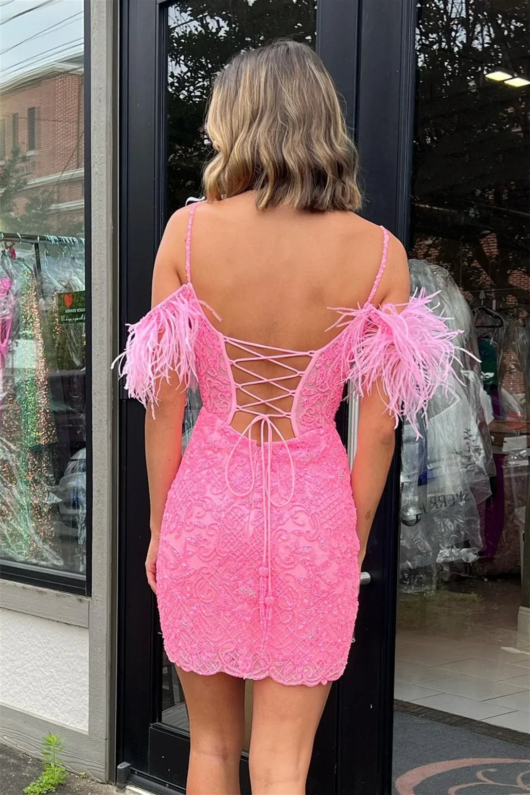 Spaghetti Straps Pink Lace Homecoming Dresses With Detachable Feather Shoulder