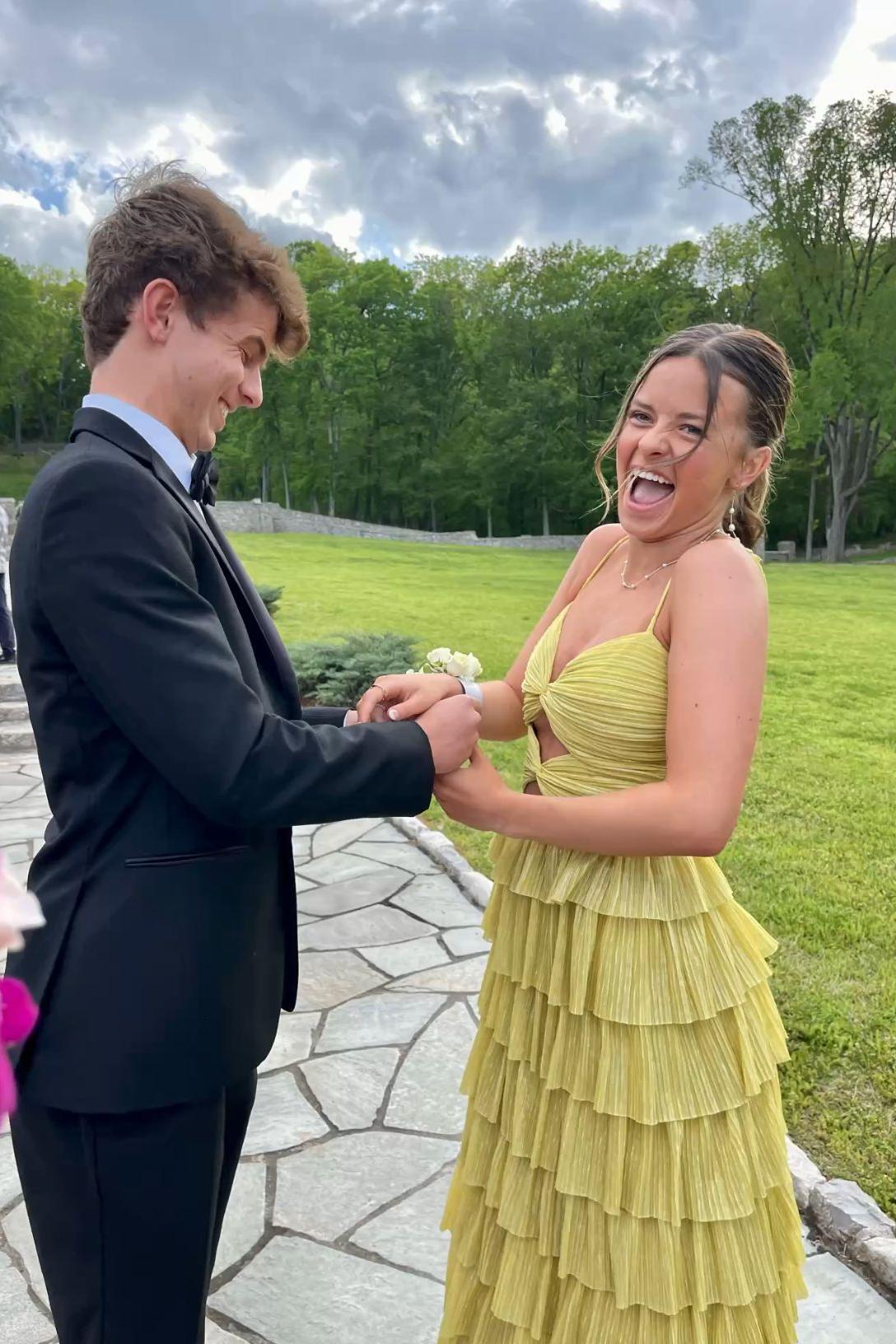 Spaghetti Straps Yellow Keyhole Tiered Ruffle Long Formal Dress