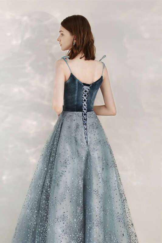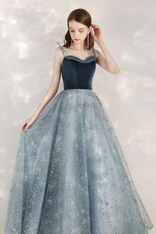 Sparkle A-line Blue Long Formal Dress with Velvet Bodice