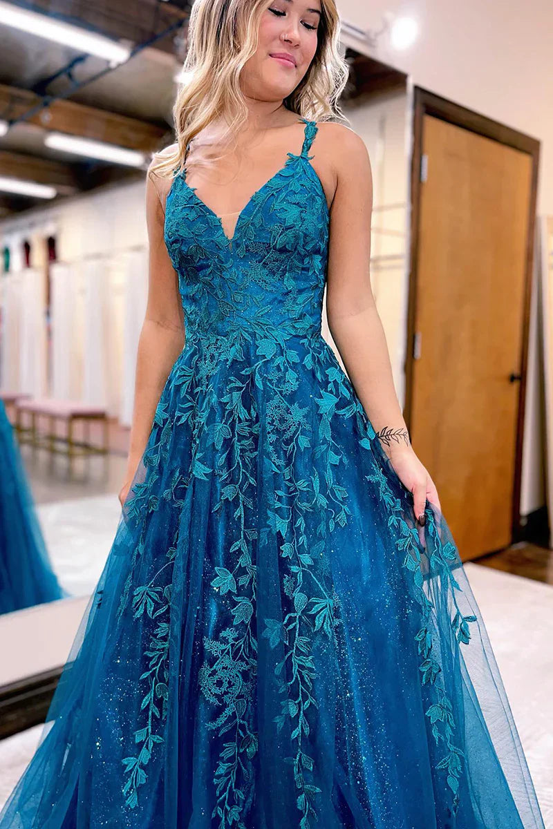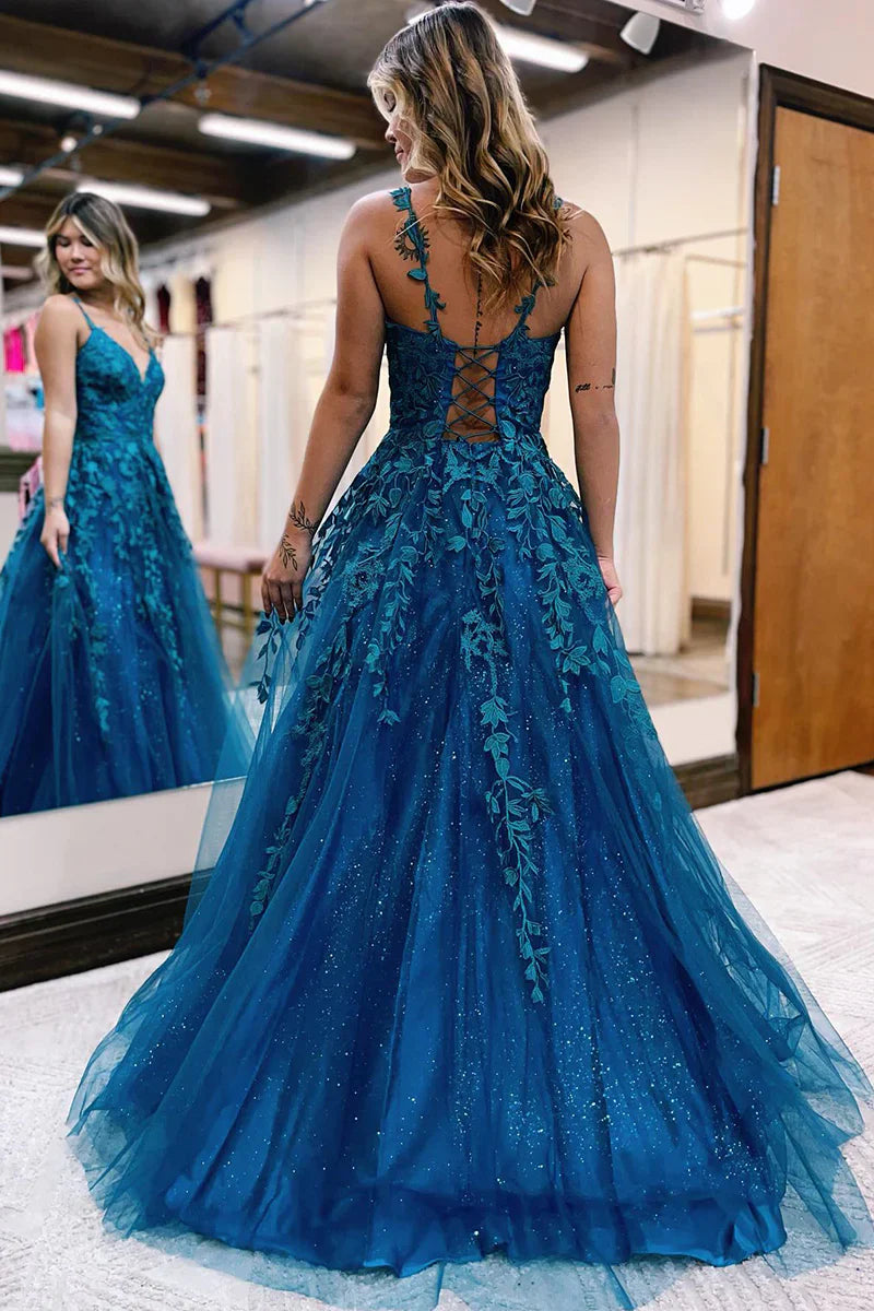 Sparkle A-Line Lace V-Neck Long Evening Prom Dress
