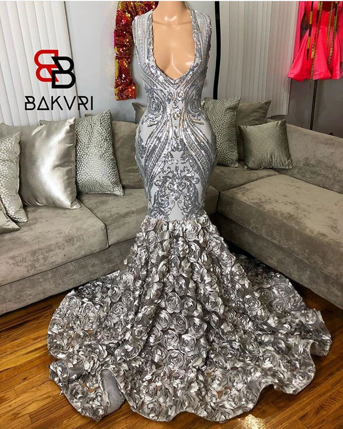 Sparkling Sequins Sliver Flower Prom dresses | Sexy Deep V-neck Mermaid Evening Gowns,SSR1156