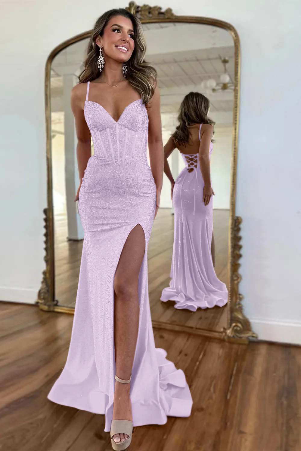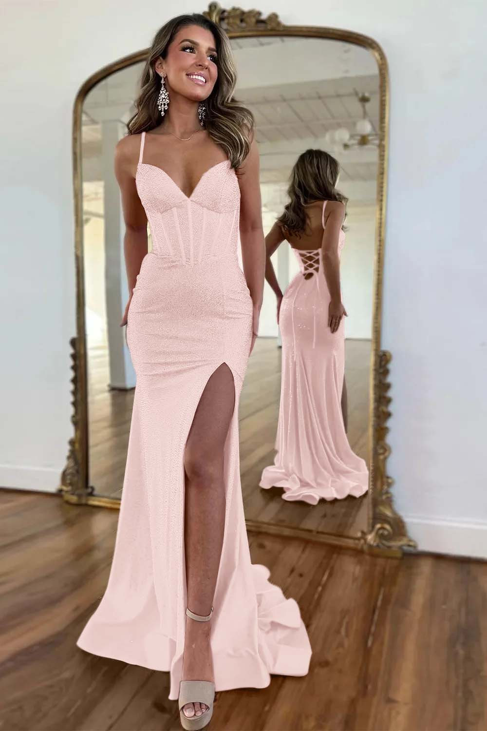 Sparkly Fuchsia Prom Dress Spaghetti Straps Lace Up Long Beaded With Slit YH0081