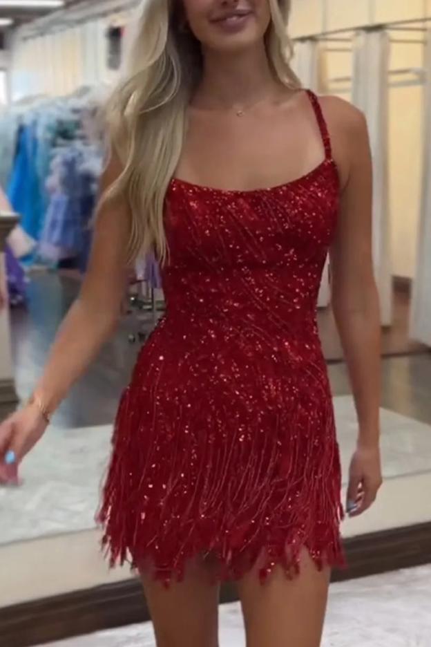 Eleri | Sparkly Sheath Spaghetti Straps Gold Short Homecoming Dress with Tassel