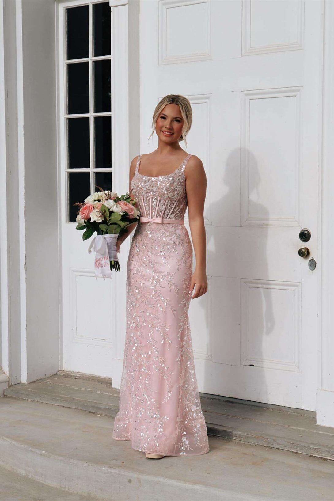 Square Neck Pink Appliques Tulle Fitted Prom Dress