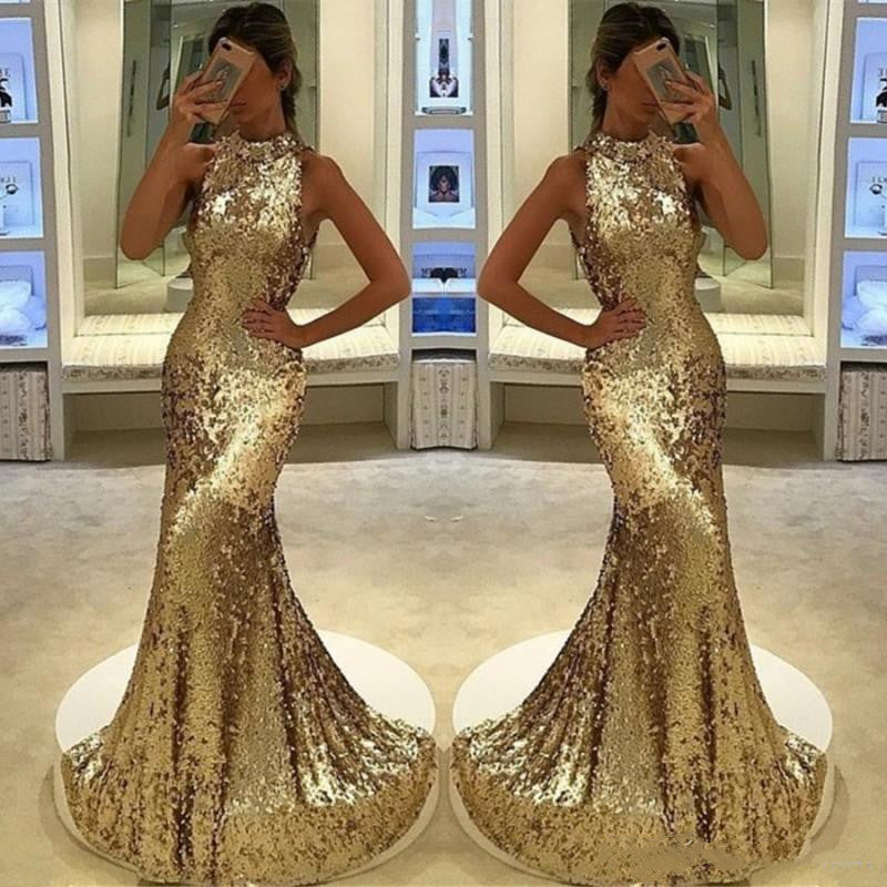 SSR0050,Halter Mermaid/Trumpet Gold Sequence Prom Dresses
