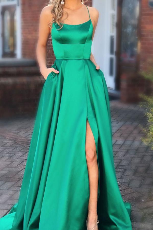 SSR0151,Discount Green Spaghetti Straps Satin Cross Back Long Prom Dress With Sweep Train