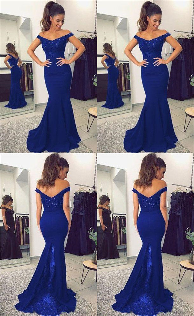 SSR0212,Sexy off the shoulder blue long prom dress applique beaded evening formal gown