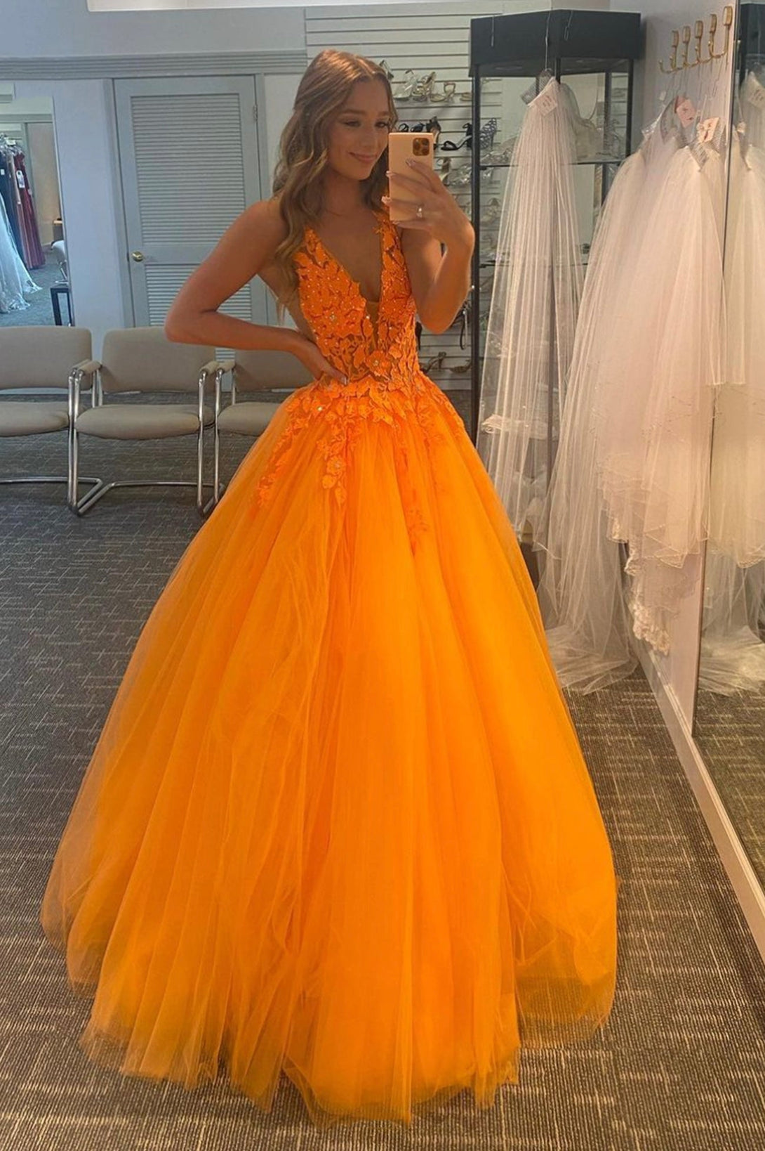 SSR0237,Orange long prom dress v-neck evening dresses a-line prom dresses applique beaded tulle dress