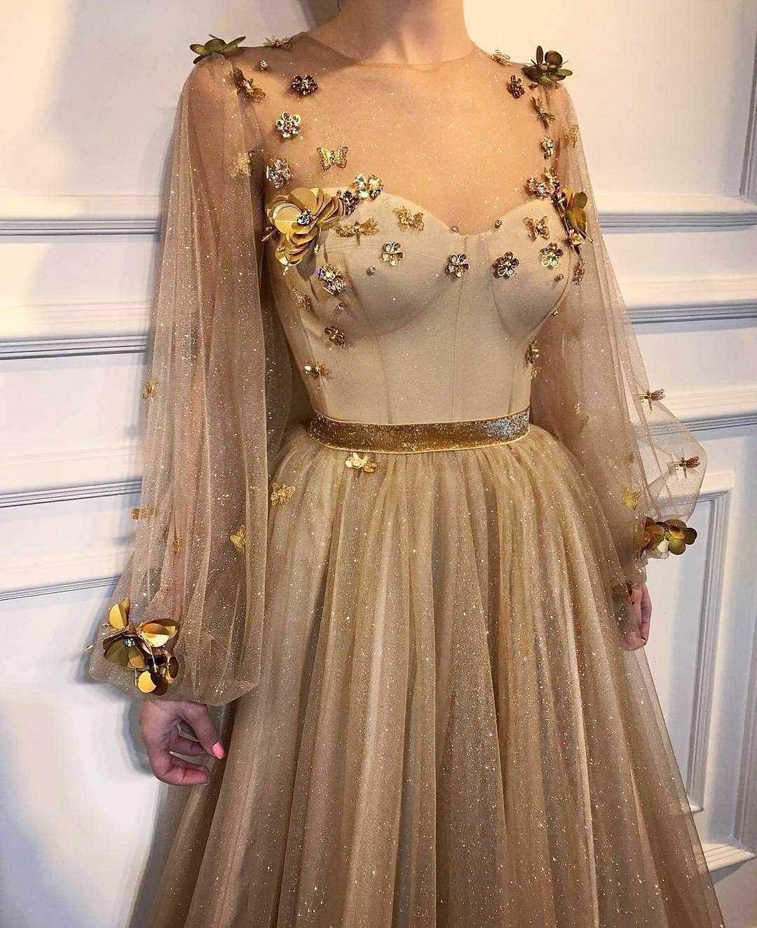 SSR0420,Gold prom dresses long sleeves a line evening dress gold applique party dress
