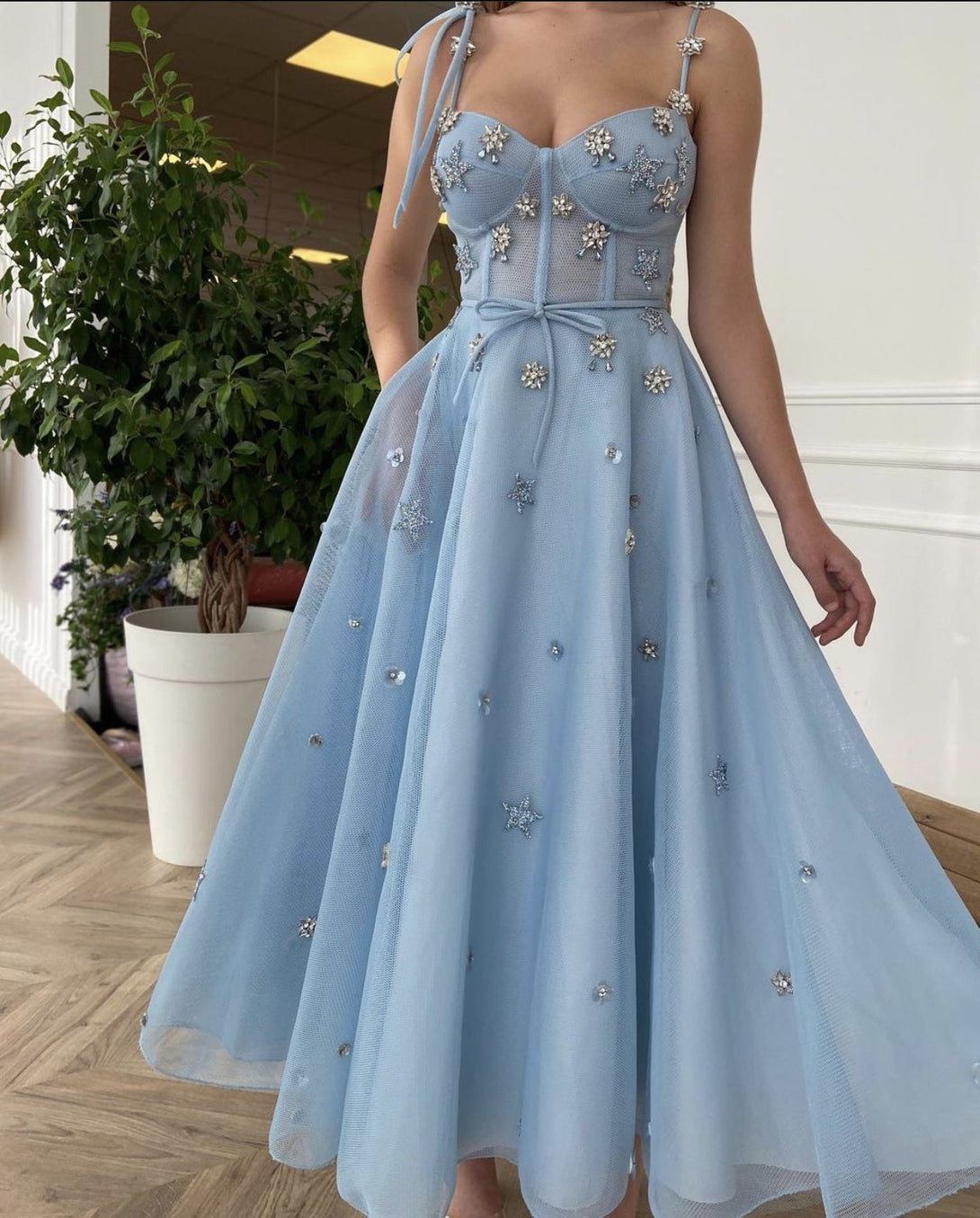 SSR0588,Light Blue A-Line Prom Dresses Spaghetti Straps Long Evening Formal Gown