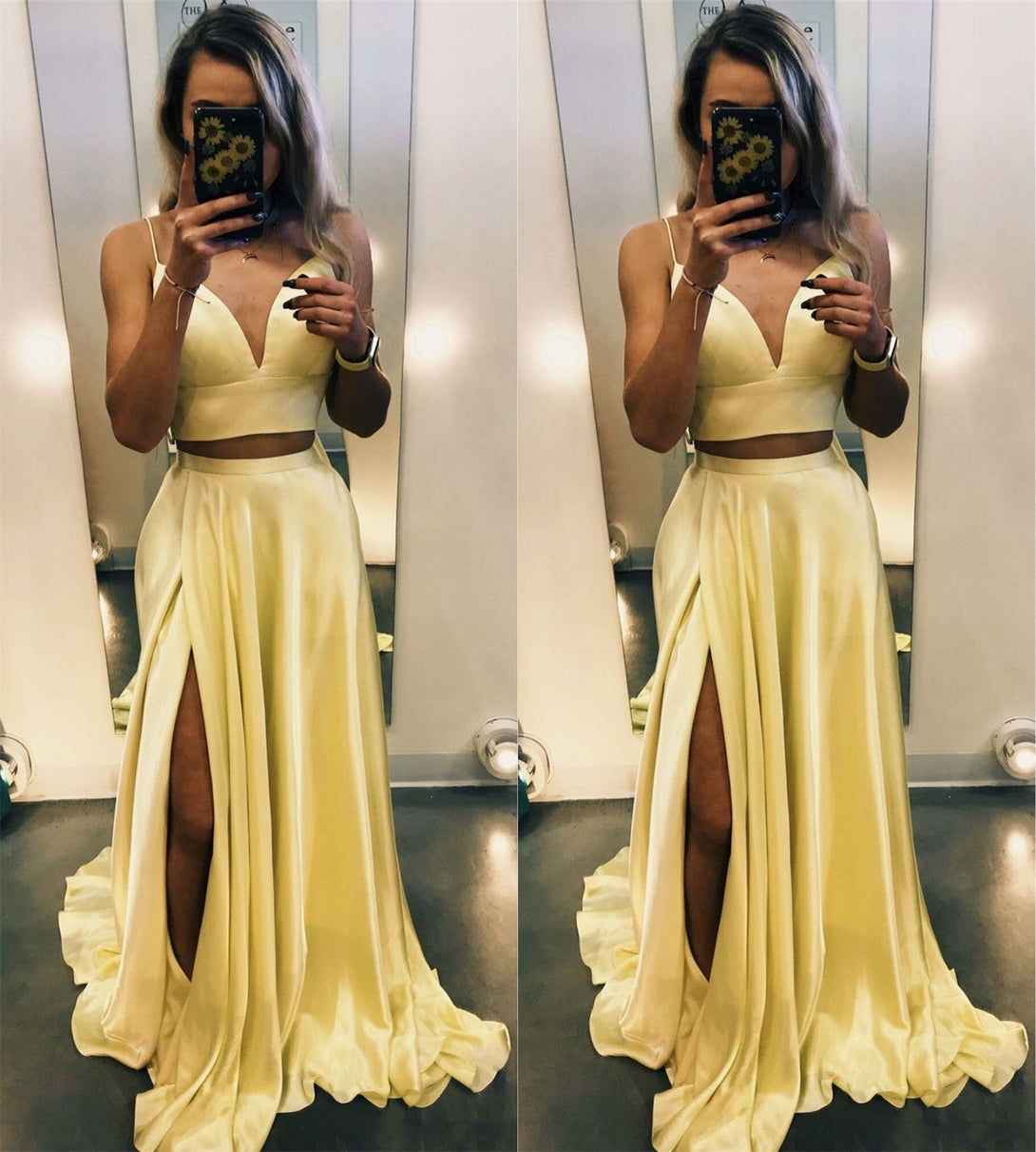 SSR0778,Two pieces prom dresses,yellow satin evening dress,a-line formal gown