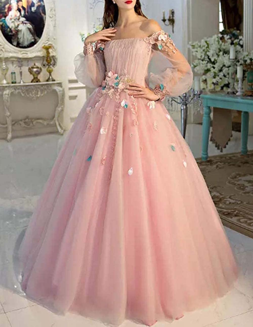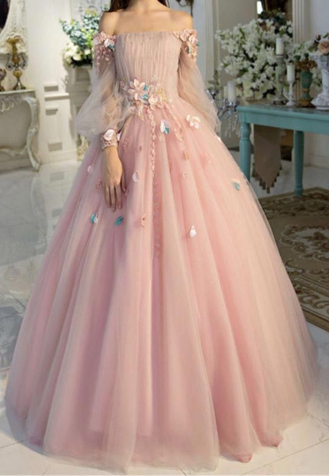 SSR1016,Long Sleeve Prom Dresses, Pearl Pink Ball Gown Long Floral Fairy Prom Dress