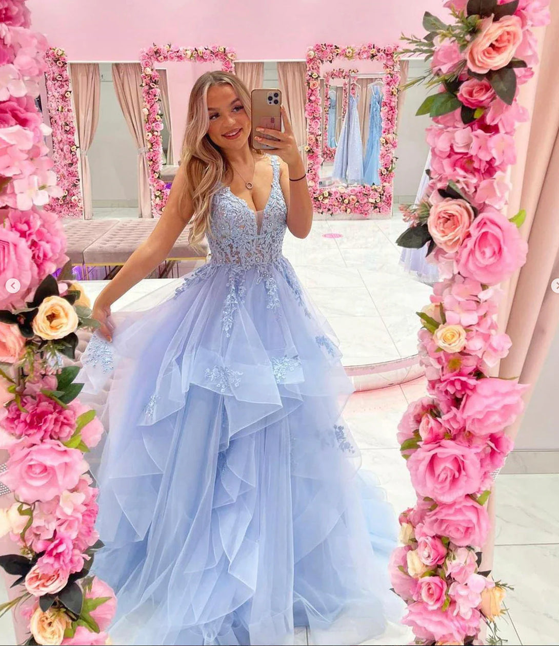 SSR1053,Blue tulle lace long prom dress A line formal dress