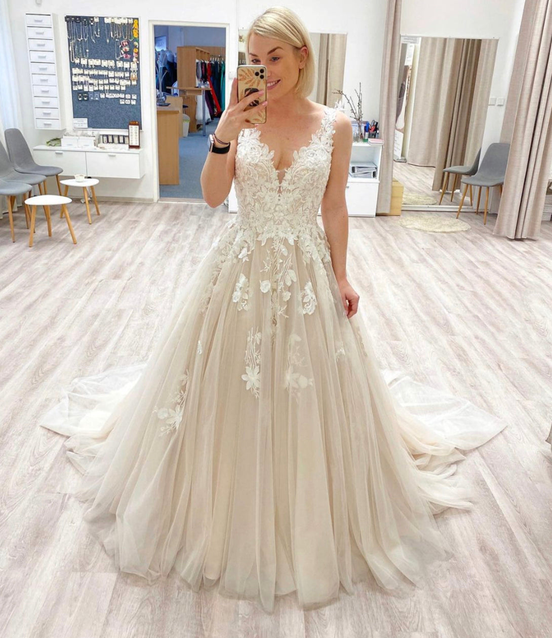 SSR1062,Light champagne tulle prom dress,a-line applique v-neck long evening formal dresses,long wedding gown