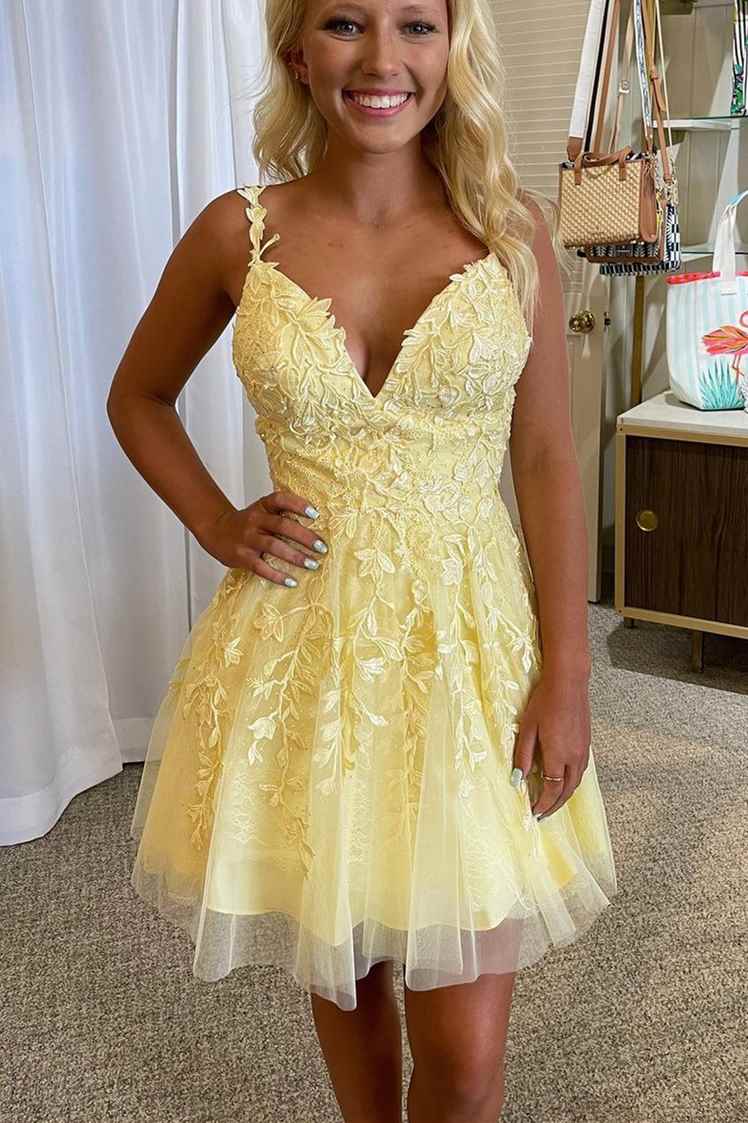 SSR1161,Princess Yellow Appliques A-line Short Homecoming Dress
