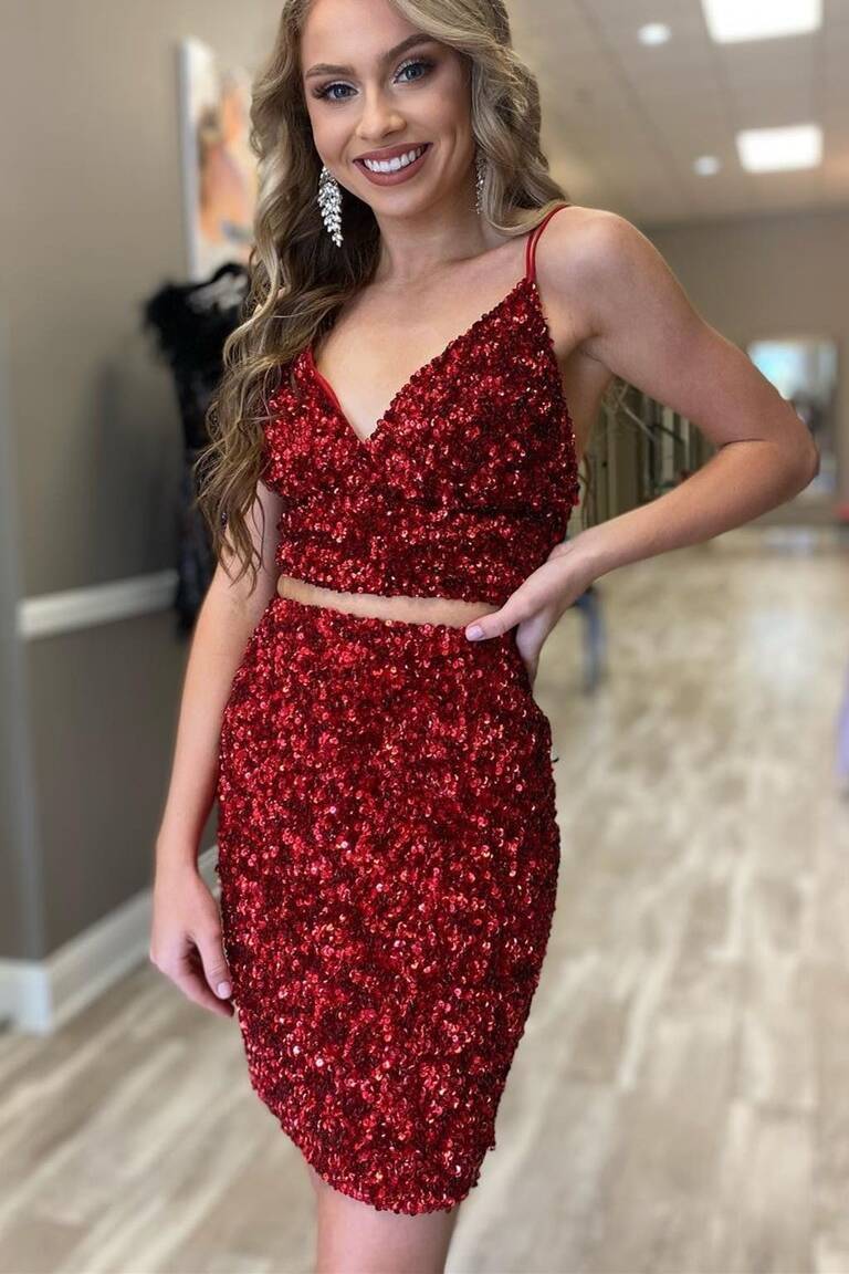 SSR1168,Two Piece Tight Red Sequins Homecoming Dress