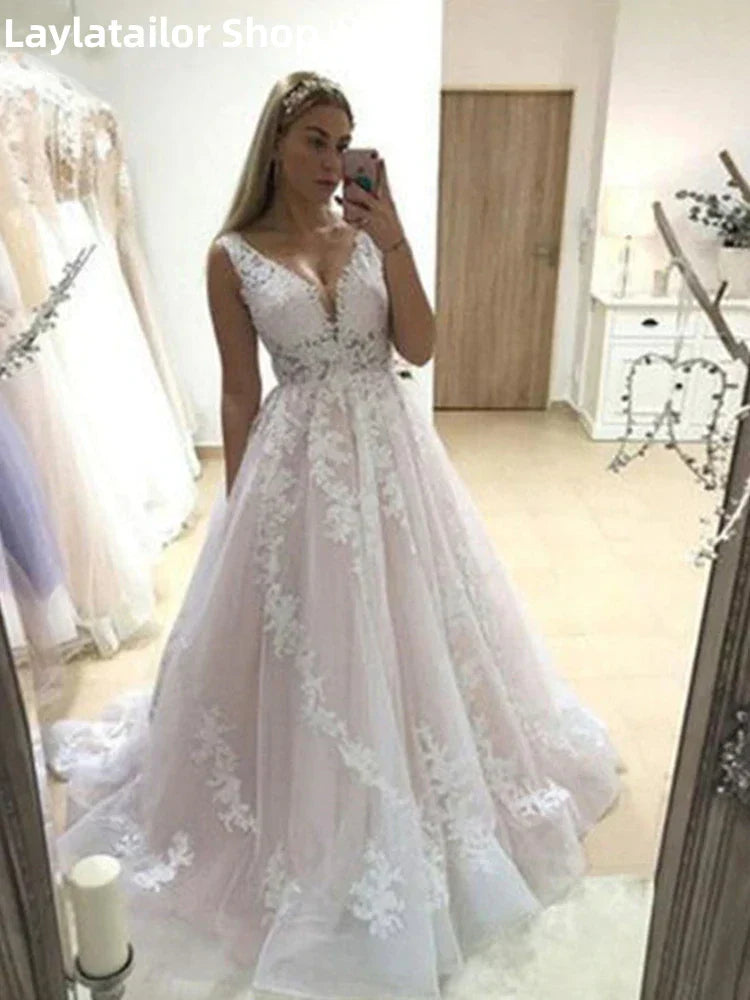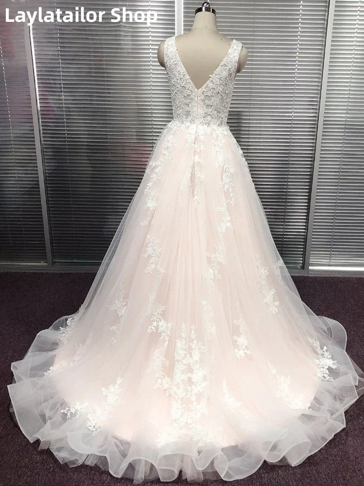 SSR1202,Pink Wedding Dress V Neck Bridal Gowns Backless Sleeveless Lace Bride Dresses Country vestidos de noiva
