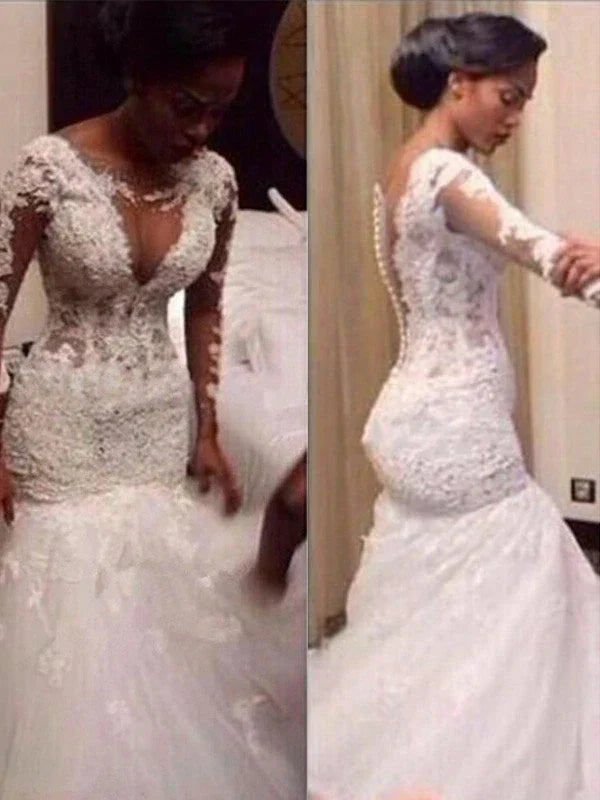 SSR1212,V-neck Floor-Length Long Lace Trumpet/Mermaid Sleeves Tulle Wedding Dresses