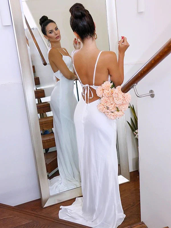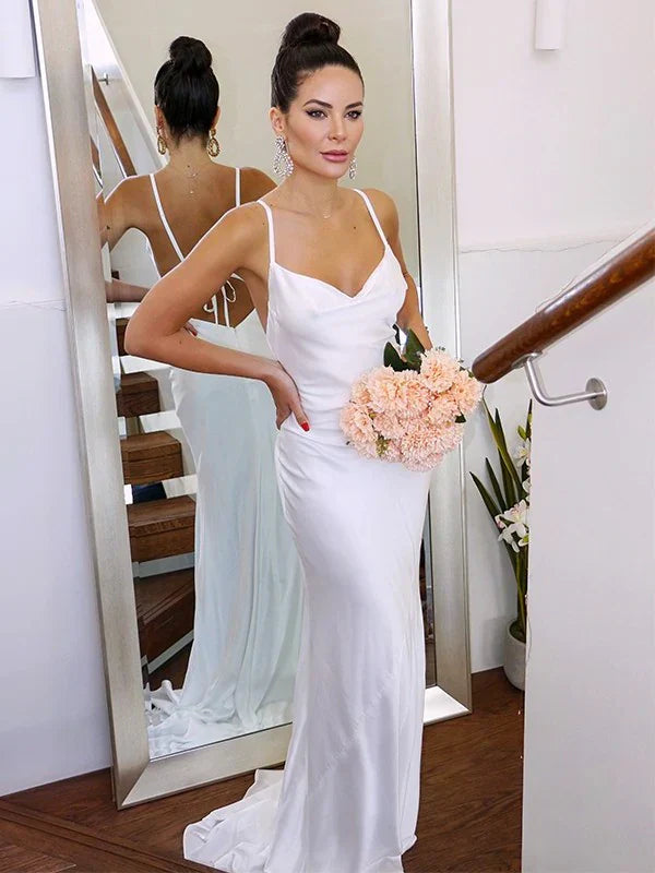 SSR1214,Sweep/Brush Charmeuse Sheath/Column Straps Spaghetti Ruched Sleeveless Train Wedding Dresses