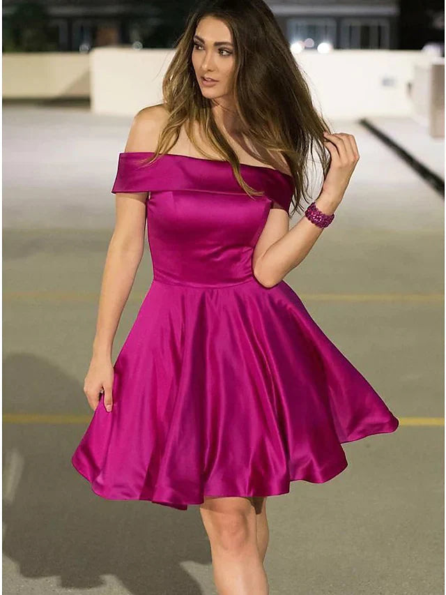 SSR1406,A-Line Cocktail Dresses Flirty Dress Engagement Knee Length Homecoming Dresses Sleeveless Off Shoulder Satin with Pleats Cocktail Party Dresses