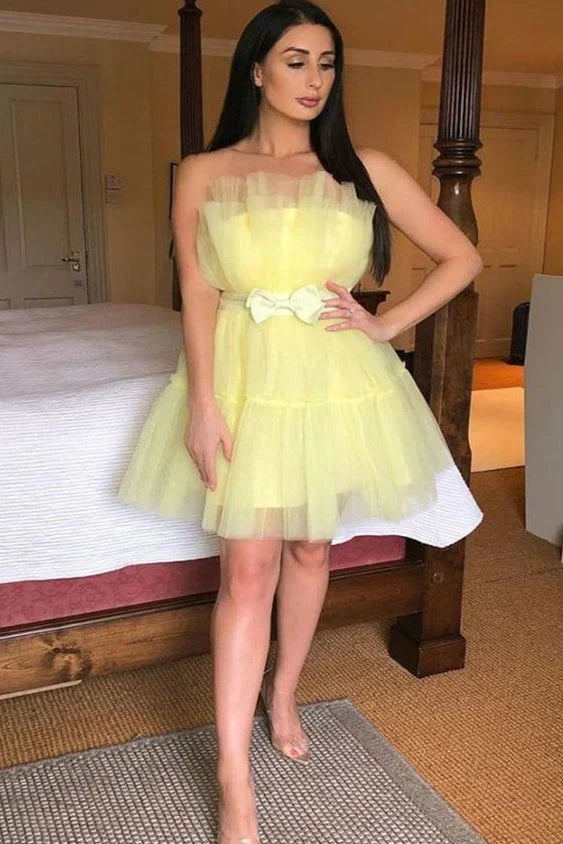 SSR1423,Simple A line Yellow Tulle Strapless Short Prom Dress, Homecoming Dresses