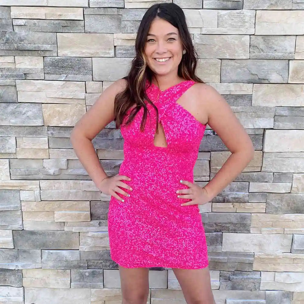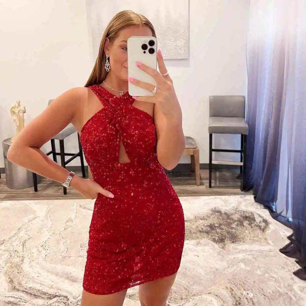 SSR1462,Cross Straps Red Sequined Tight Homecoming Dress