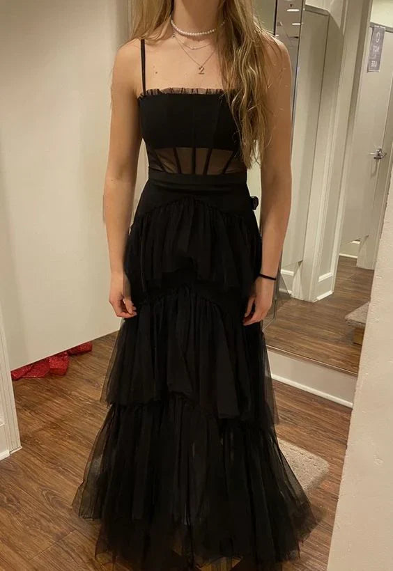 SSR1647,Spaghetti Strap Mesh Corset Gown Long Prom Dress Black Evening Dress