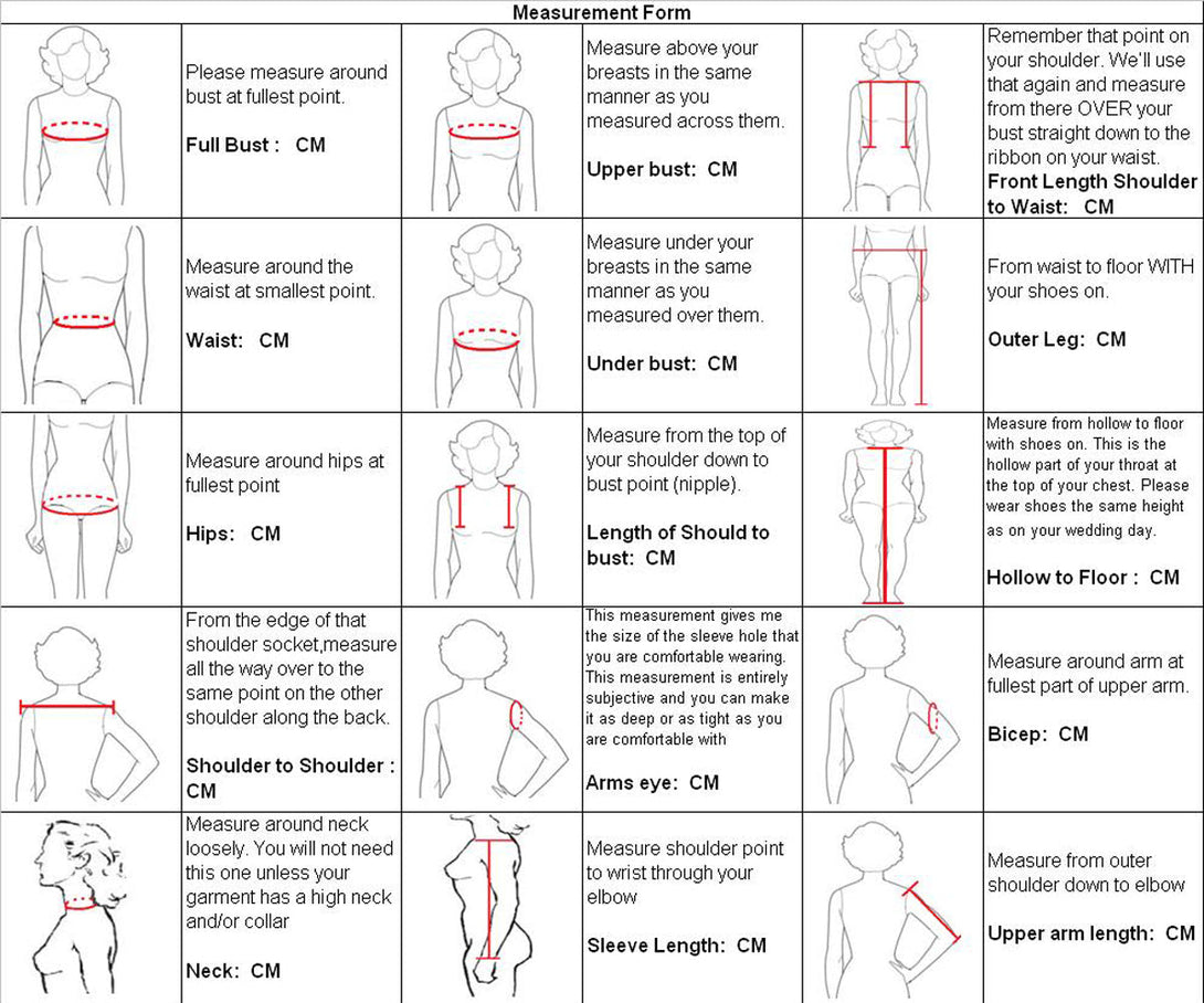 Custom Size. Please check our standard size chart carefully if you choose standard size and make sure the standard size could be fit you well. Your size. (bust). (waist). (hips). (Hollow to Hem). It is very important. Please do use the SIZE CHART IMAGE in the?above.?If dress is custom made, we need to size as following: