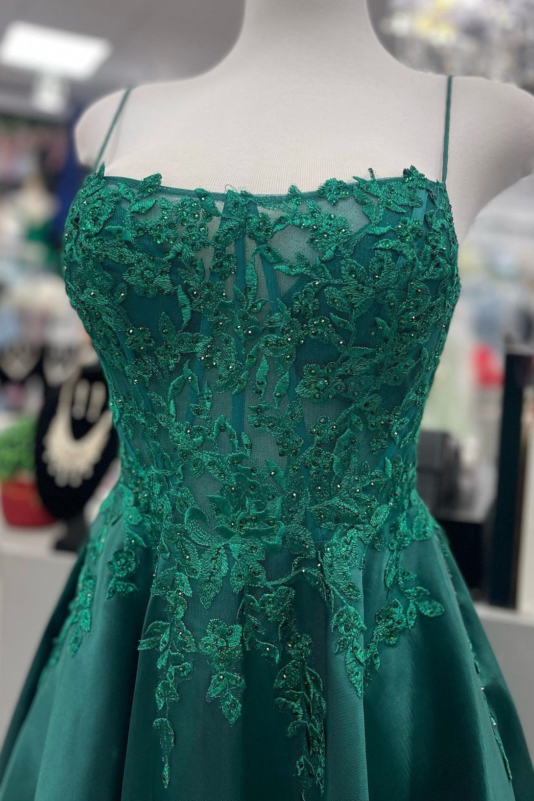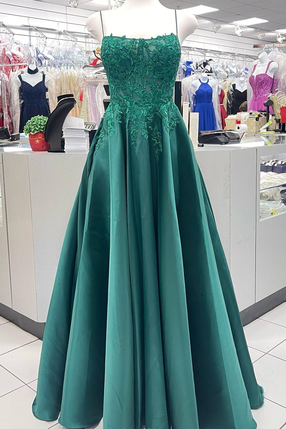 Starps Green Satin A-line Long Prom Dress